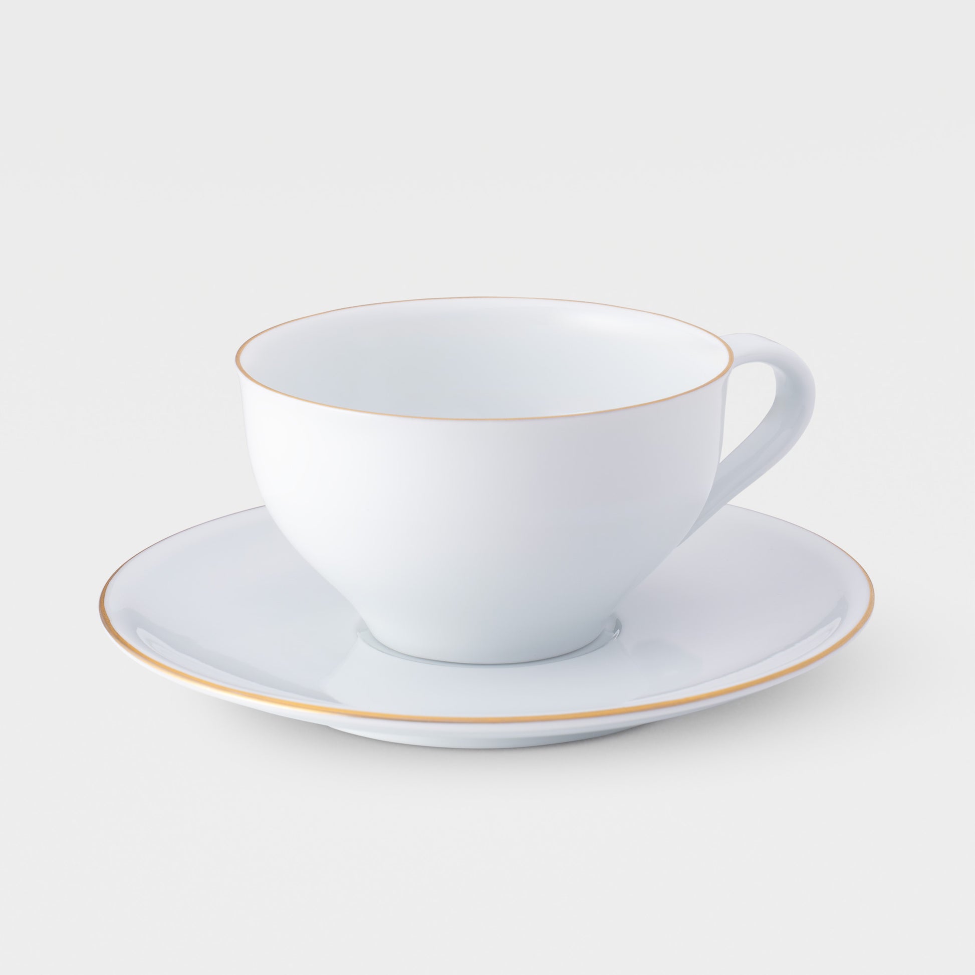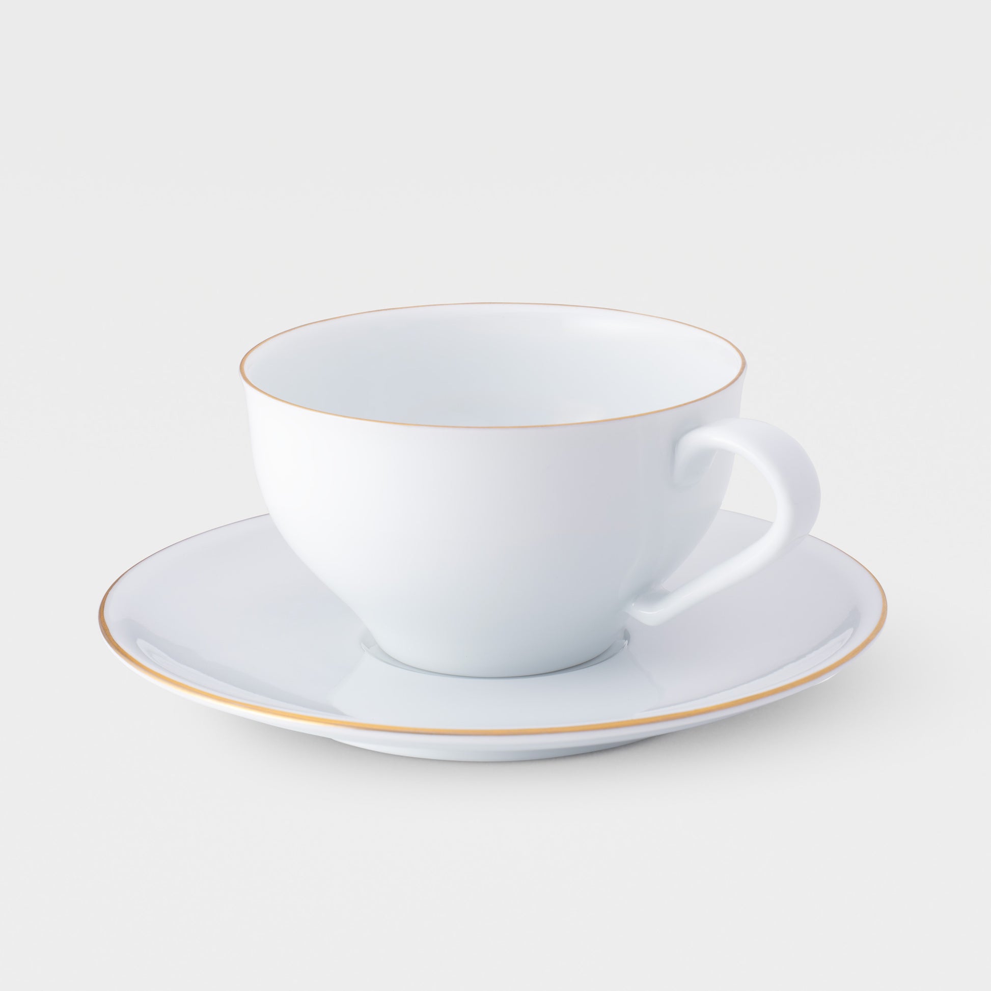 This cup is not only functional but also beautifully designed, featuring a thick handle for perfect balance and a sleek curve that appeals to the observant eye, highlighted by elegant gold accents. It comes with a coaster for easy lifting, and the eternal white of the porcelain beautifully showcases the coffee's true color, enhancing your coffee experience.