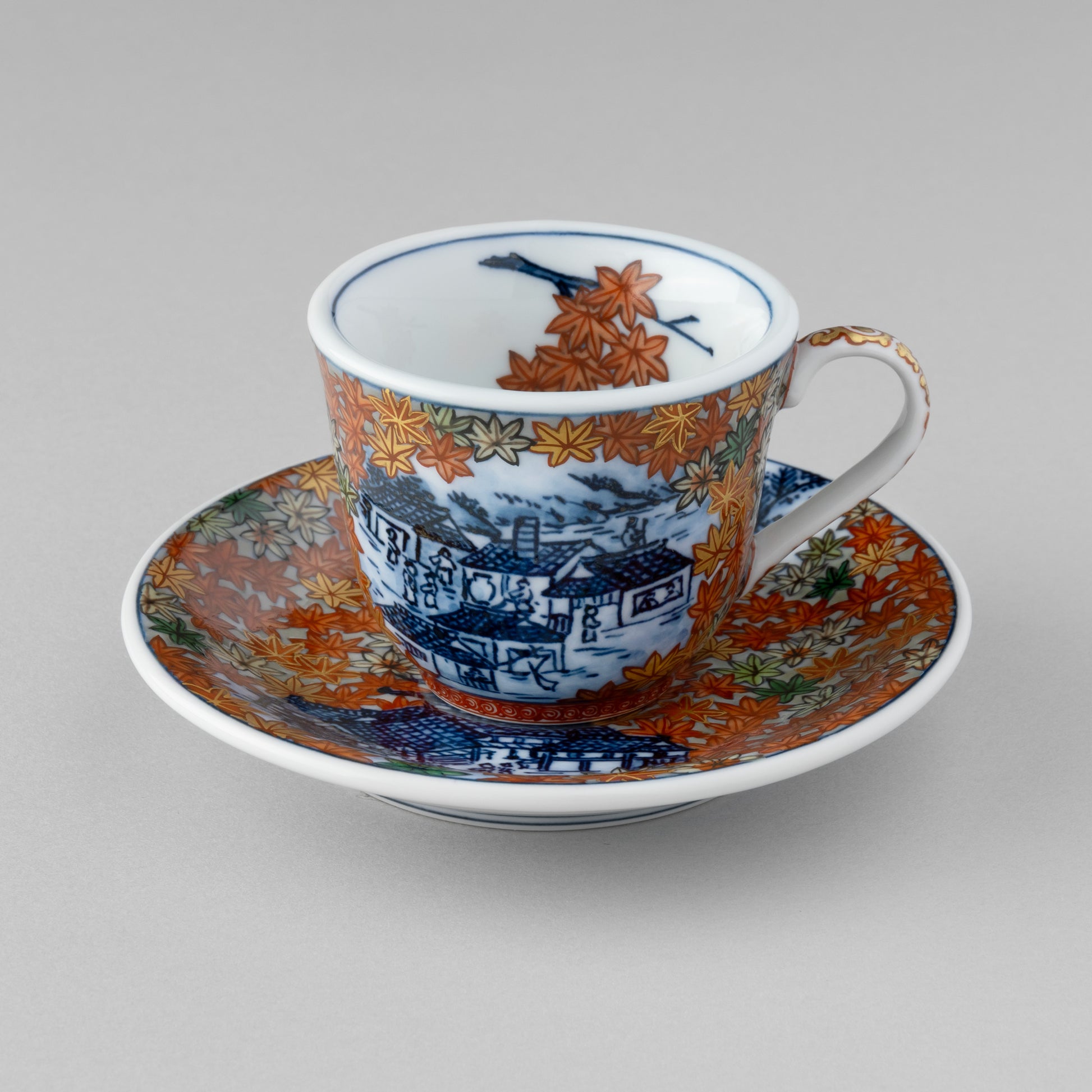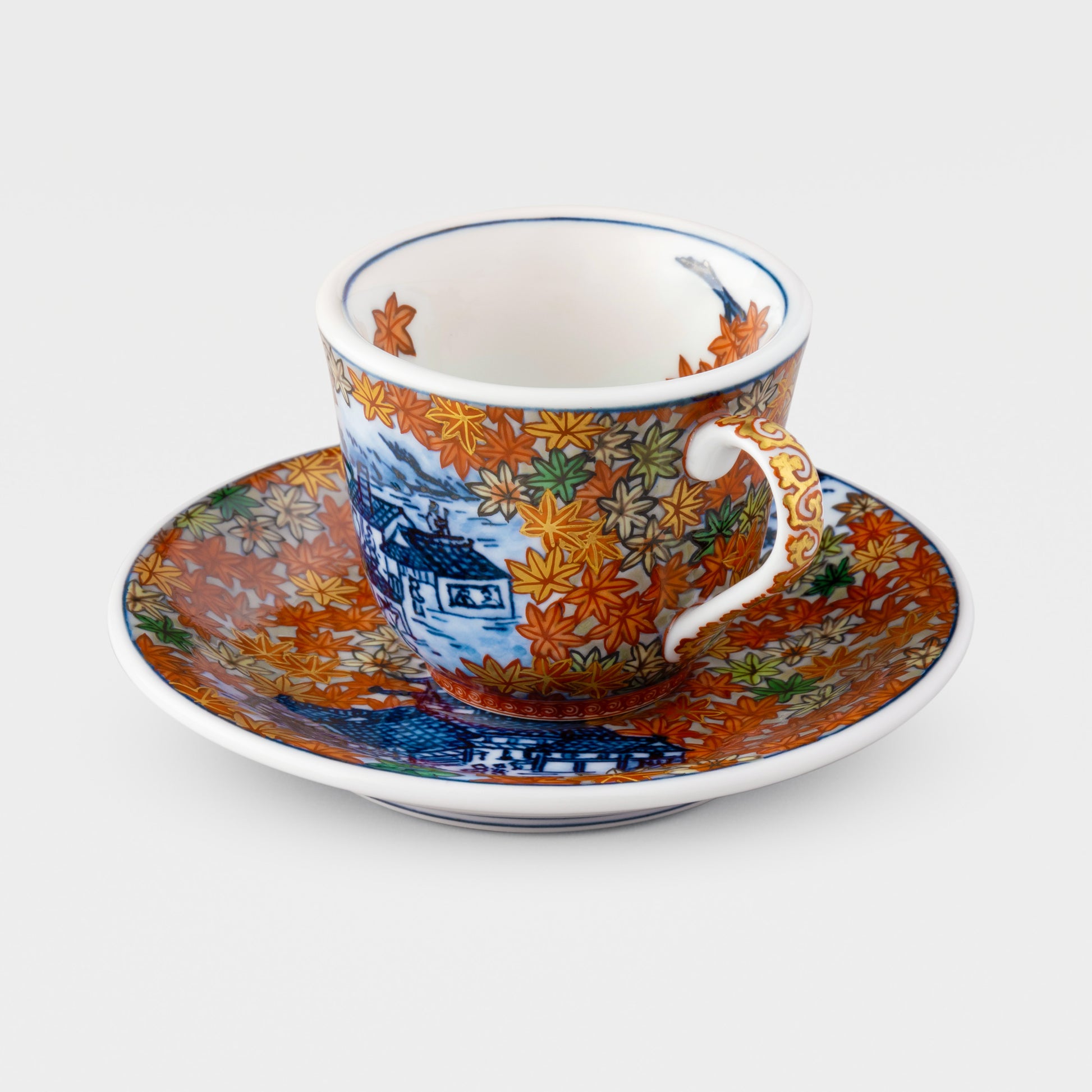 The saucer accompanying the cup mirrors the main design elements with a similar pattern, forming a cohesive set. An added touch of luxury is evident in the shimmering real gold accents, notably on the cup's handle and the edges. This gold detailing not only elevates the overall aesthetic but also signifies the premium quality and craftsmanship of the piece. The combination of the hand-painted design, the representation of Kyoto's autumnal beauty, and the gold embellishments make this porcelain cup a true work of art, reflecting both cultural significance and exquisite craftsmanship.