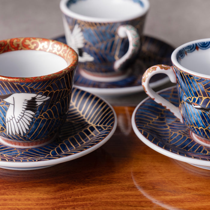 This piece features a vibrant combination of green and gold, accentuated by the striking blue. The saucer, adorned with a captivating black and gold pattern, will undoubtedly leave observers marveling at the precision of its hand painting.